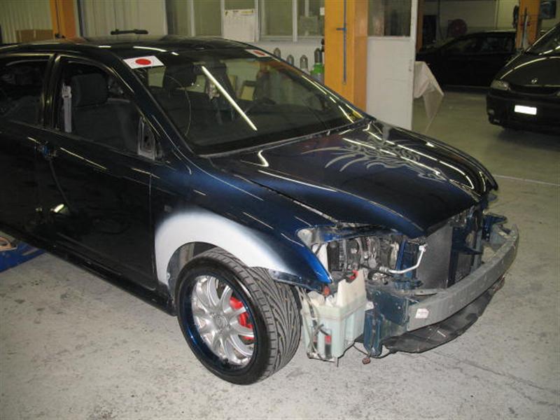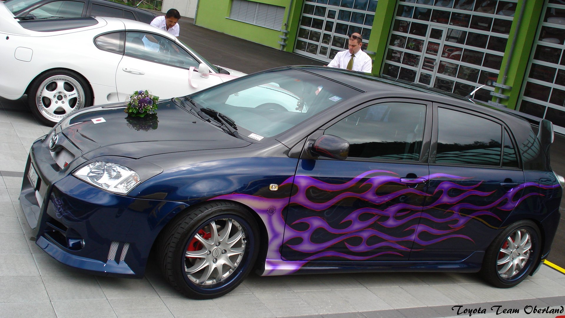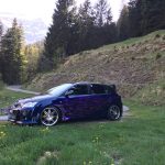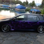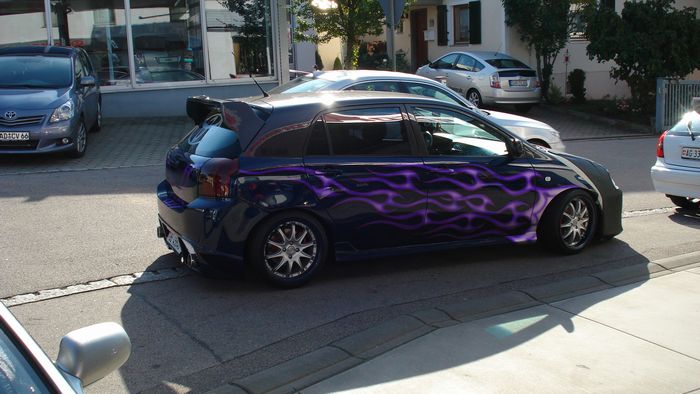 – Dezente Airbrush Lackierung blau mét – dunkelgrau – mit violettem Flammendesign und rotem Pinstripe